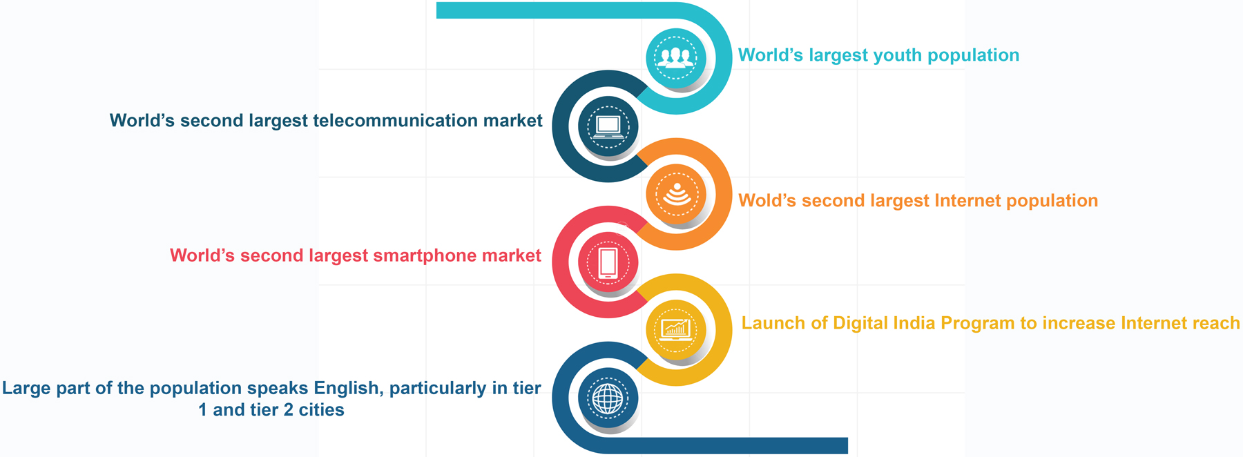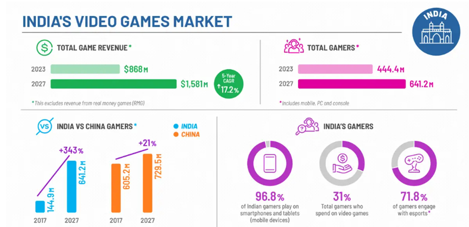India is on the road to becoming a gaming superpower. There are over 400 gaming organisations in India, which is the home to around 420 million online gamers. The gaming industry at present registers a growth rate of 38%. By the year 2025, the gaming industry in India is anticipated to reach $3.9 billion in value. Within the year 2023, the gamers are expected to be more than 450 million in numbers. India is second only to China in terms of the number of online gamers. The lockdown due to Covid-19 pandemic further witnessed an increase in the number of online gamers and online gaming in India, with games installed at 7.3 billion in the year 2020, which was the highest in the world.